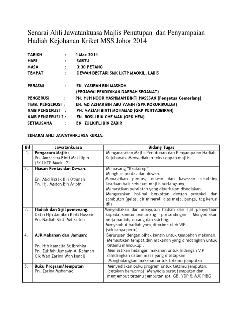 Senarai Ahli Jawatankuasa Majlis Penutupan Dan Penyampaian Hadiah Kejohanan Kriket Mss Johor 2014 Pdf